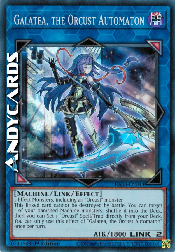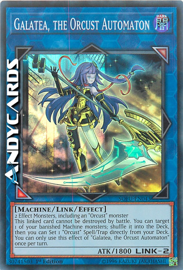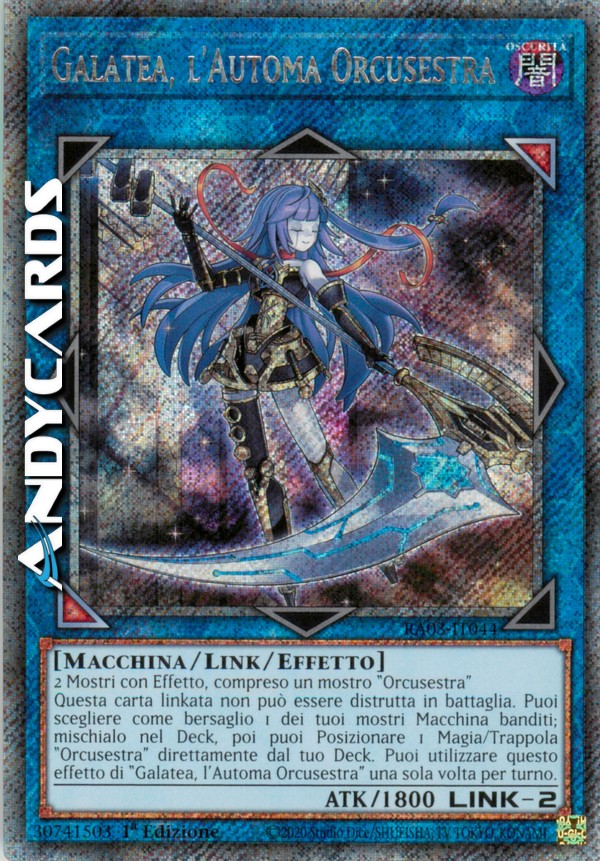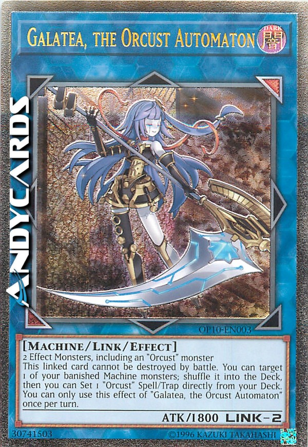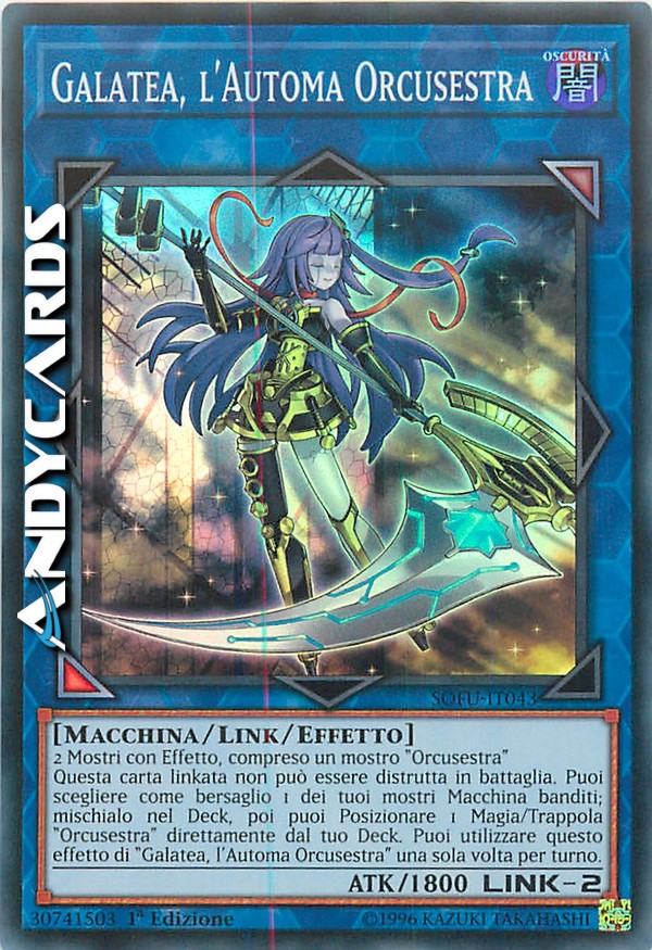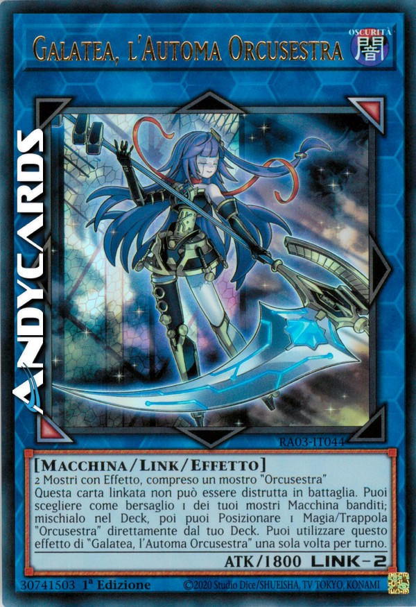 Questa carta linkata non può essere distrutta in battaglia. Puoi scegliere come bersaglio 1 dei tuoi mostri Macchina banditi; mischialo nel Deck, poi puoi Posizionare 1 Magia/Trappola "Orcusestra" direttamente dal tuo Deck. Puoi utilizzare questo effetto di "Galatea, l'Automa Orcusestra" una sola volta per turno.