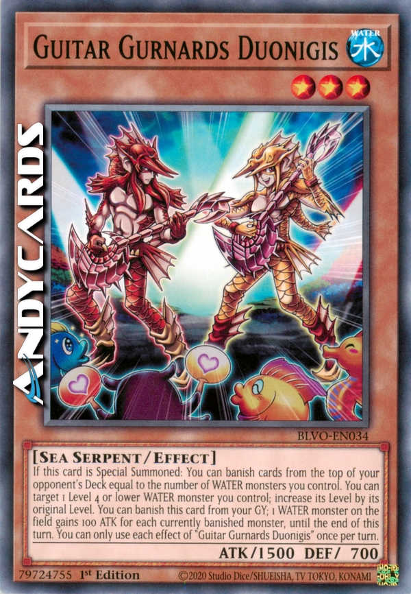 If this card is Special Summoned: You can banish cards from the top of your opponent's Deck equal to the number of WATER monsters you control. You can target 1 Level 4 or lower WATER monster you control; increase its Level by its original Level. You can banish this card from your GY; 1 WATER monster on the field gains 100 ATK for each currently banished monster, until the end of this turn. You can only use each effect of "Guitar Gurnards Duonigis" once per turn.
