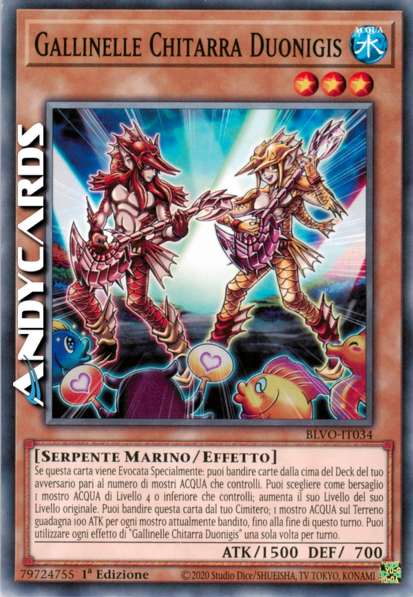 Se questa carta viene Evocata Specialmente: puoi bandire carte dalla cima del Deck del tuo avversario pari al numero di mostri ACQUA che controlli. Puoi scegliere come bersaglio 1 mostro ACQUA di Livello 4 o inferiore che controlli; aumenta il suo Livello del suo Livello originale. Puoi bandire questa carta dal tuo Cimitero; 1 mostro ACQUA sul Terreno guadagna 100 ATK per ogni mostro attualmente bandito, fino alla fine di questo turno. Puoi utilizzare ogni effetto di "Gallinelle Chitarra Duonigis" una sola volta per turno.