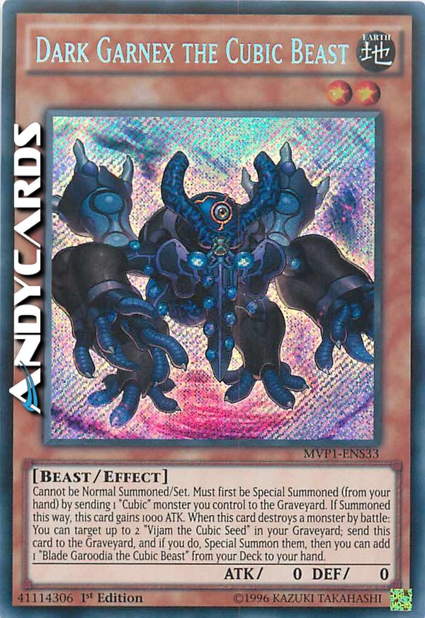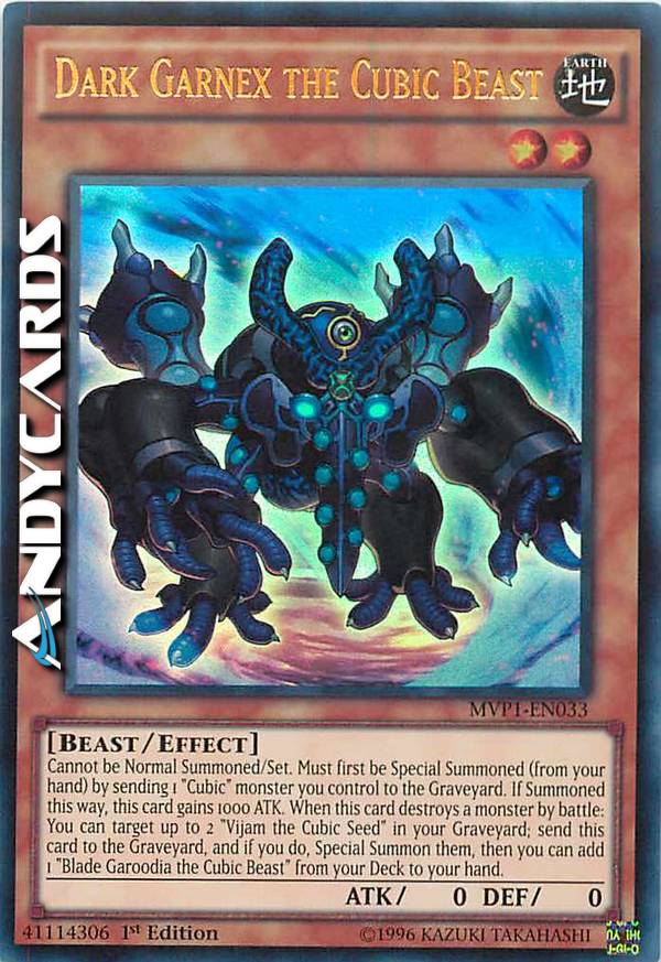 Cannot be Normal Summoned/Set. Must first be Special Summoned (from your hand) by sending 1 "Cubic" monster you control to the Graveyard. If Summoned this way, this card gains 1000 ATK. When this card destroys a monster by battle: You can target up to 2 "Vijam the Cubic Seed" in your Graveyard; send this card to the Graveyard, and if you do, Special Summon them, then you can add 1 "Blade Garoodia the Cubic Beast" from your Deck to your hand.