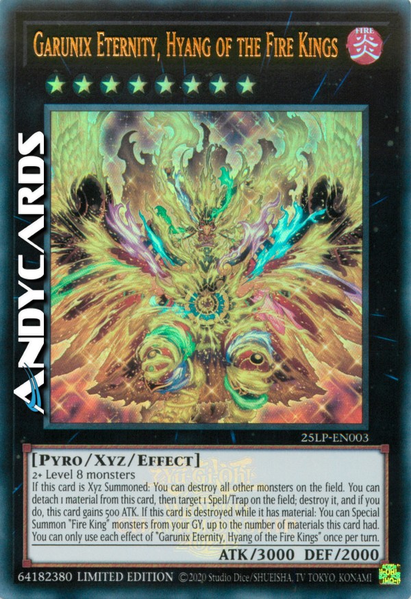 Se questa carta viene Evocata Xyz: puoi distruggere tutti gli altri mostri sul Terreno. Puoi staccare 1 materiale da questa carta, poi scegliere come bersaglio 1 Magia/Trappola sul Terreno; distruggila e, se lo fai, questa carta guadagna 500 ATK. Se questa carta viene distrutta mentre ha materiale: puoi Evocare Specialmente mostri "Re del Fuoco" dal tuo Cimitero, fino al numero di materiali che questa carta aveva. Puoi utilizzare ogni effetto di "Garunix Eternità, Hyang dei Re del Fuoco" una sola volta per turno.