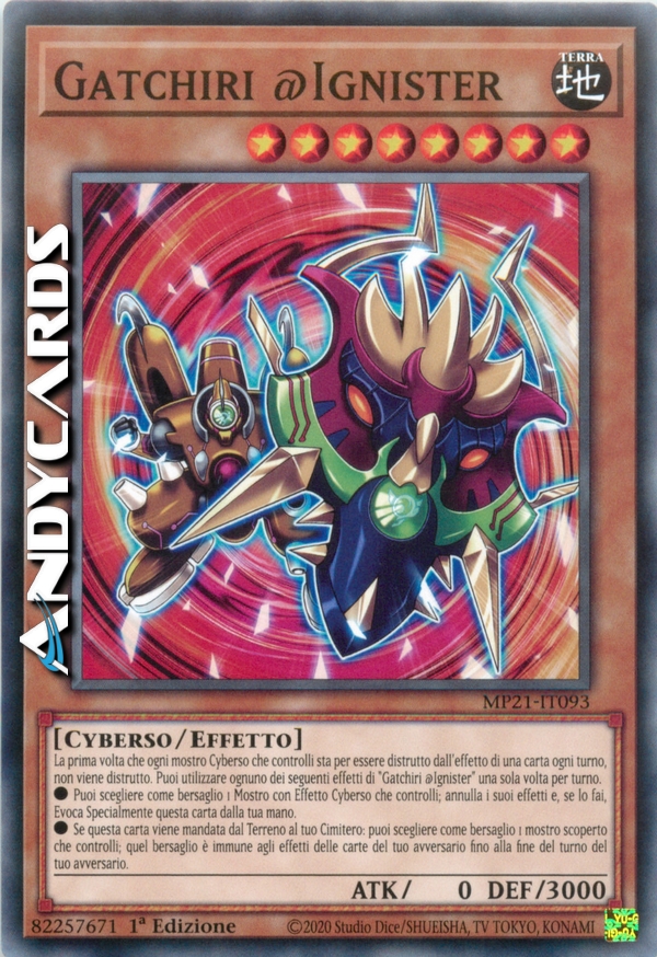 La prima volta che ogni mostro Cyberso che controlli sta per essere distrutto dall'effetto di una carta ogni turno, non viene distrutto. Puoi utilizzare ognuno dei seguenti effetti di "Gatchiri @Ignister" una sola volta per turno.