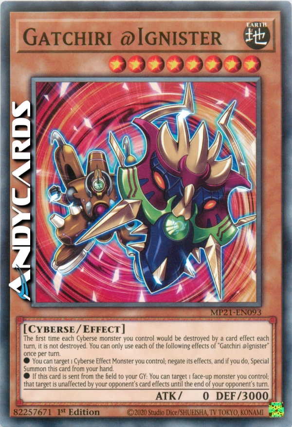 The first time each Cyberse monster you control would be destroyed by a card effect each turn, it is not destroyed. You can only use each of the following effects of "Gatchiri @Ignister" once per turn.