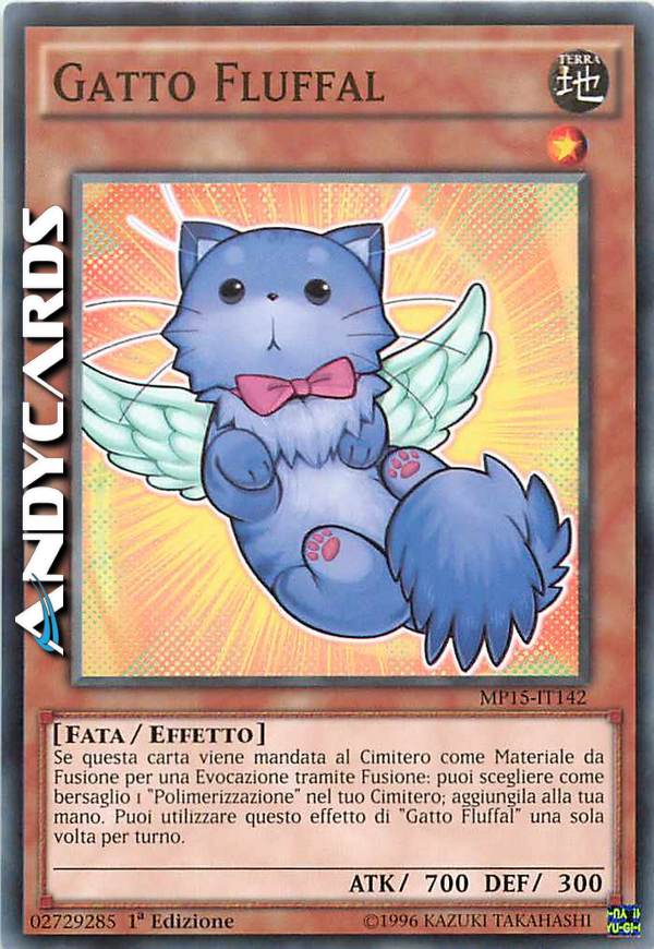 Se questa carta viene mandata al Cimitero come Materiale da Fusione per una Evocazione tramite Fusione: puoi scegliere come bersaglio 1 "Polimerizzazione" nel tuo Cimitero; aggiungila alla tua mano. Puoi utilizzare questo effetto di "Gatto Fluffal" una sola volta per turno.