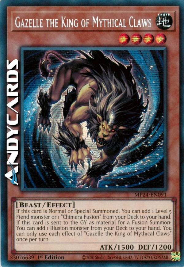 If this card is Normal or Special Summoned: You can add 1 Level 5 Fiend monster or 1 "Chimera Fusion" from your Deck to your hand. If this card is sent to the GY as material for a Fusion Summon: You can add 1 Illusion monster from your Deck to your hand. You can only use each effect of "Gazelle the King of Mythical Claws" once per turn.