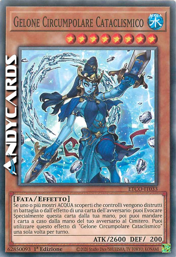 Se uno o più mostri ACQUA scoperti che controlli vengono distrutti in battaglia o dall'effetto di una carta dell'avversario: puoi Evocare Specialmente questa carta dalla tua mano, poi puoi mandare 1 carta a caso dalla mano del tuo avversario al Cimitero. Puoi utilizzare questo effetto di "Gelone Circumpolare Cataclismico" una sola volta per turno.