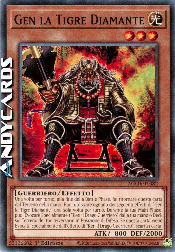 Una volta per turno, alla fine della Battle Phase: fai ritornare questa carta dal Terreno nella mano. Puoi utilizzare ognuno dei seguenti effetti di "Gen la Tigre Diamante" una sola volta per turno. Durante la tua Main Phase: puoi Evocare Specialmente 1 "Ken il Drago Guerriero" dalla tua mano o Deck sul Terreno del tuo avversario in Posizione di Difesa. Se questa carta viene Evocata Specialmente dall'effetto di "Ken il Drago Guerriero": scarta 1 carta.
