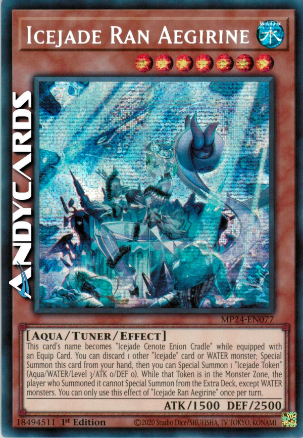 This card's name becomes "Icejade Cenote Enion Cradle" while equipped with an Equip Card. You can discard 1 other "Icejade" card or WATER monster; Special Summon this card from your hand, then you can Special Summon 1 "Icejade Token" (Aqua/WATER/Level 3/ATK 0/DEF 0). While that Token is in the Monster Zone, the player who Summoned it cannot Special Summon from the Extra Deck, except WATER monsters. You can only use this effect of "Icejade Ran Aegirine" once per turn.