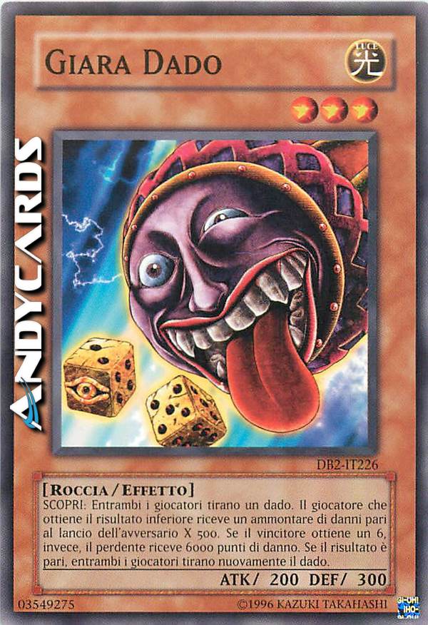 FLIP: Both players roll a six-sided die once. The player with the lowest result takes Direct Damage equal to his/her opponent’s result X 500 Life Points. However, if a winner’s result is 6, the loser takes 6000 points of Direct Damage. If the results are the same, both players roll again.