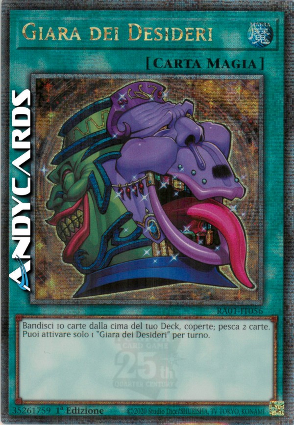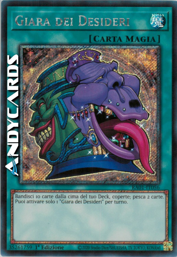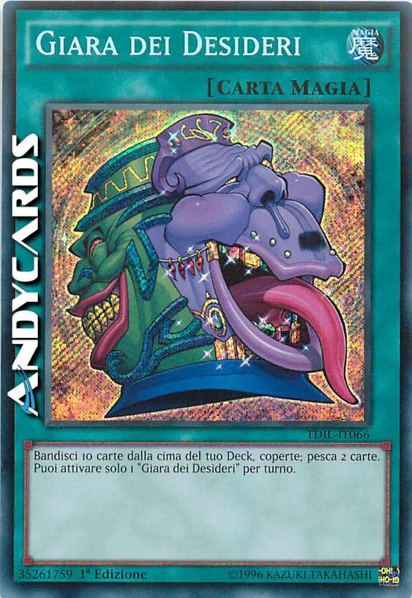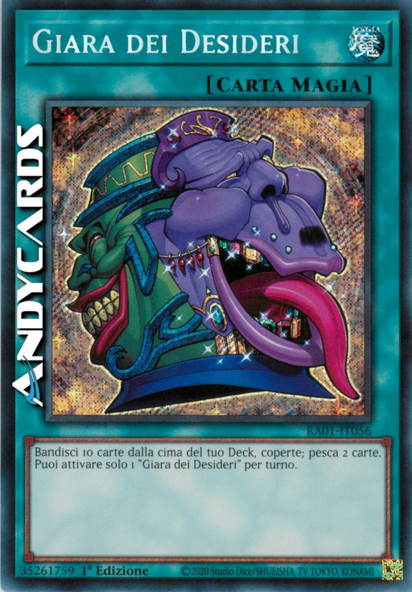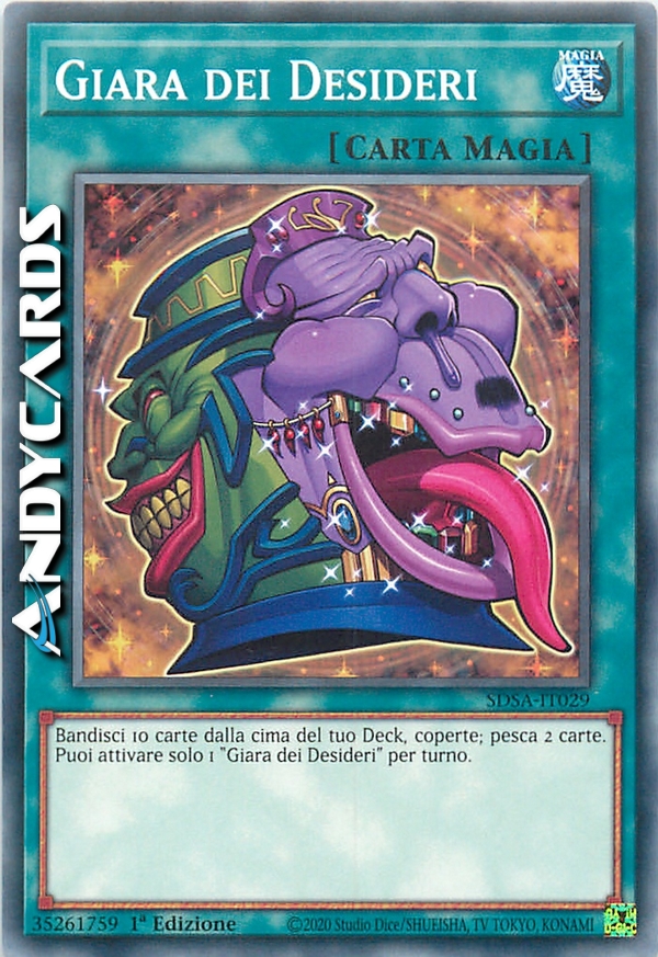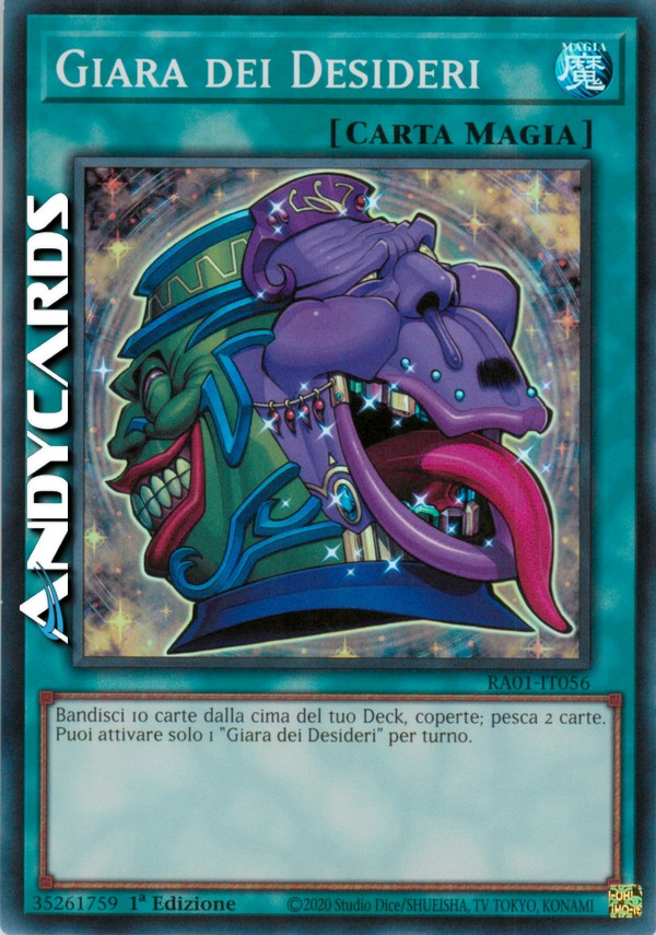 Bandisci 10 carte dalla cima del tuo Deck, coperte; pesca 2 carte. Puoi attivare solo 1 "Giara dei Desideri" per turno.