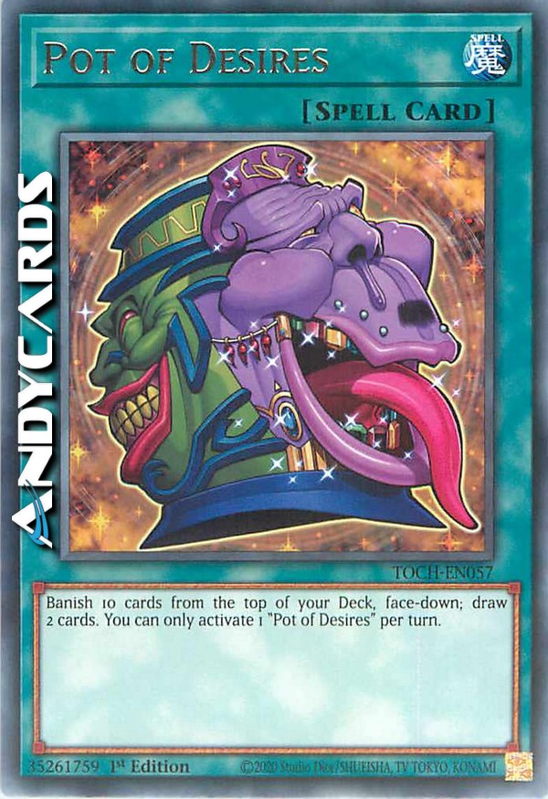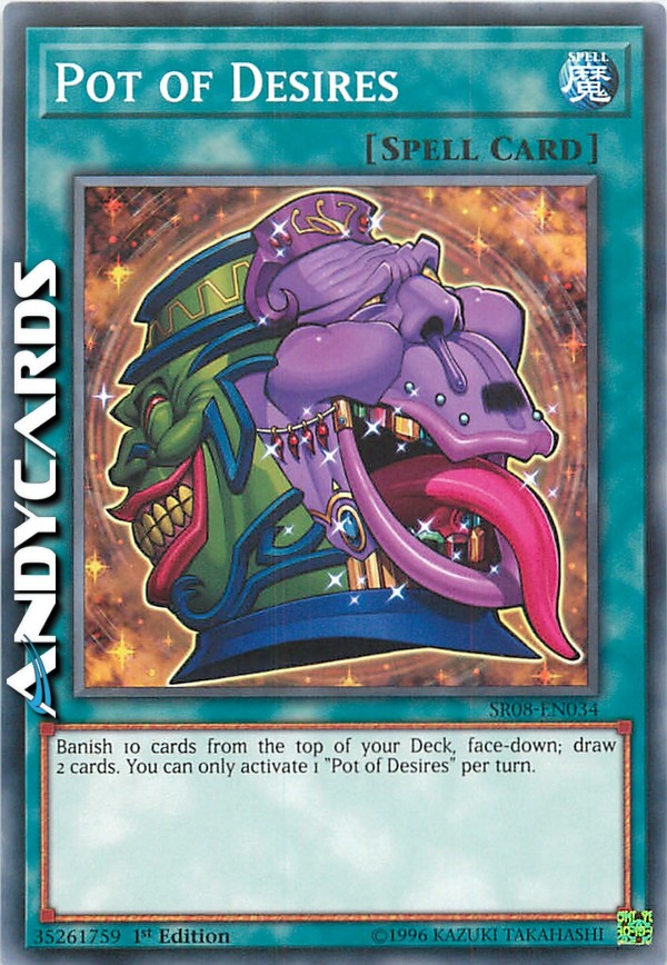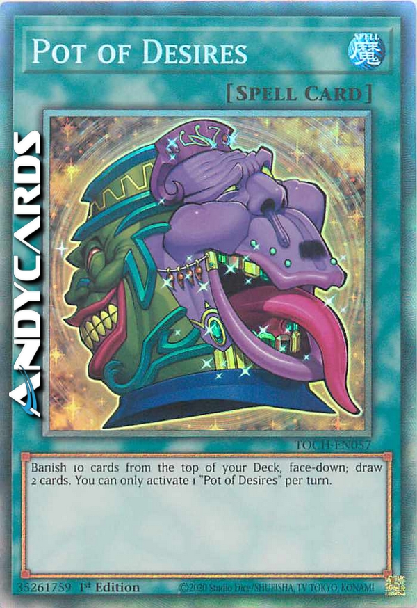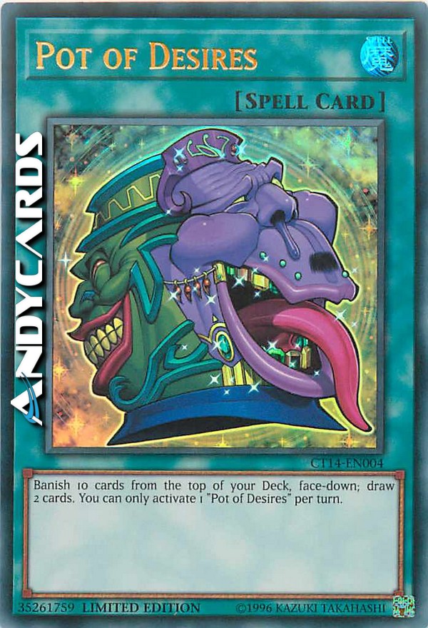 Banish 10 cards from the top of your Deck, face-down; draw 2 cards. You can only activate 1 "Pot of Desires" per turn.