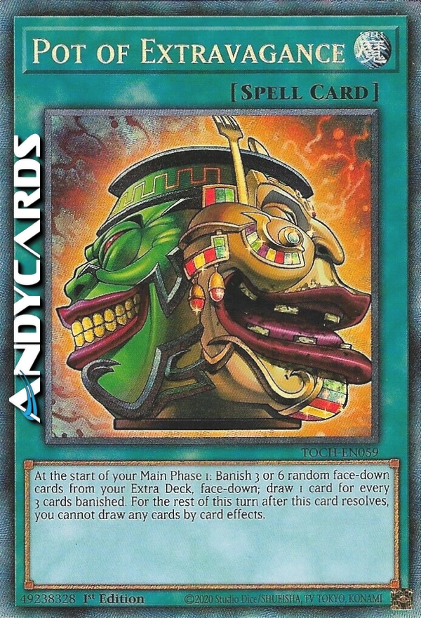 At the start of your Main Phase 1: Banish 3 or 6 random face-down cards from your Extra Deck, face-down; draw 1 card for every 3 cards banished. For the rest of this turn after this card resolves, you cannot draw any cards by card effects.