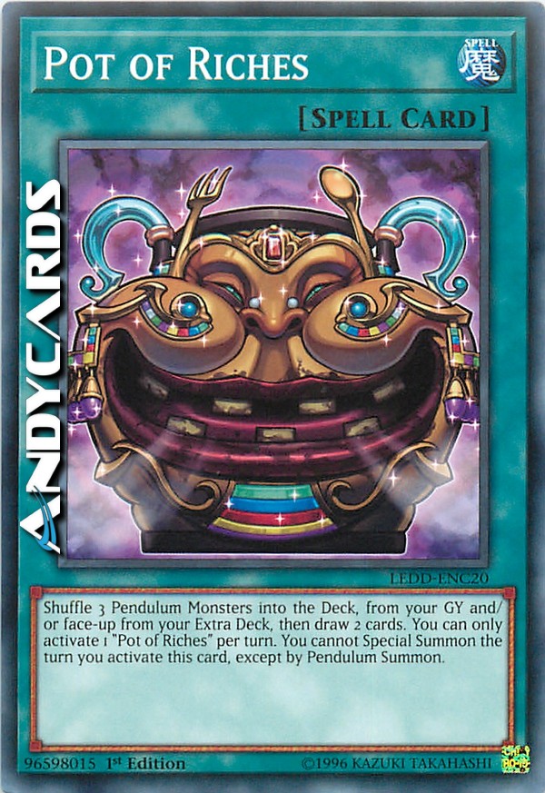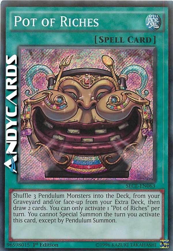 Shuffle 3 Pendulum Monsters into the Deck, from your Graveyard and/or face-up in your Extra Deck, then draw 2 cards. You can only activate 1 "Pot of Riches" per turn. You cannot Special Summon the turn you activate this card, except by Pendulum Summon.