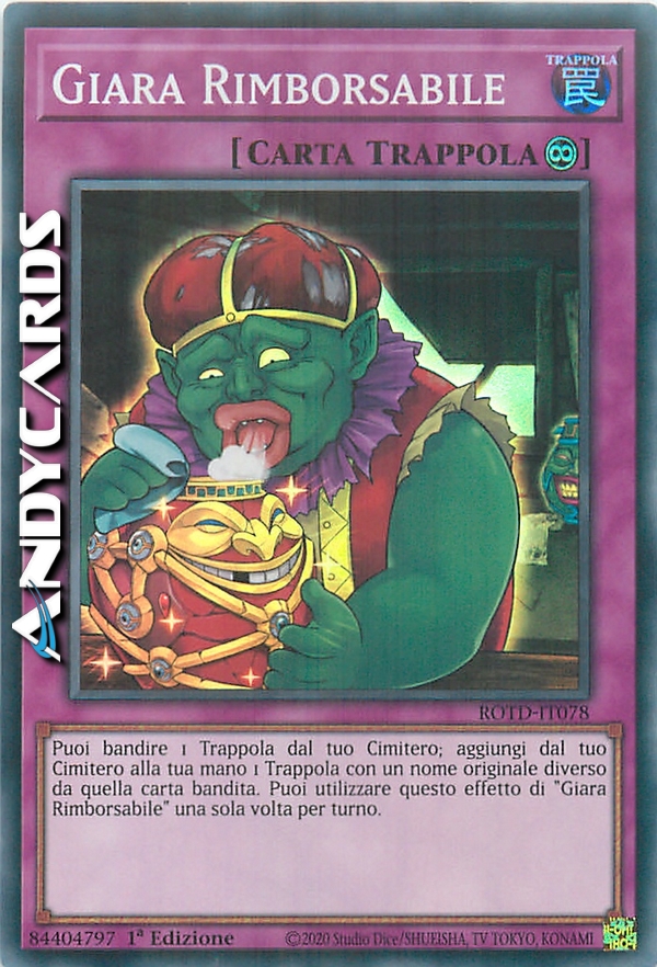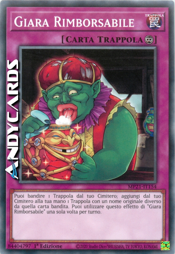 Puoi bandire 1 Trappola dal tuo Cimitero; aggiungi dal tuo Cimitero alla tua mano 1 Trappola con un nome originale diverso da quella carta bandita. Puoi utilizzare questo effetto di "Giara Rimborsabile" una sola volta per turno.
