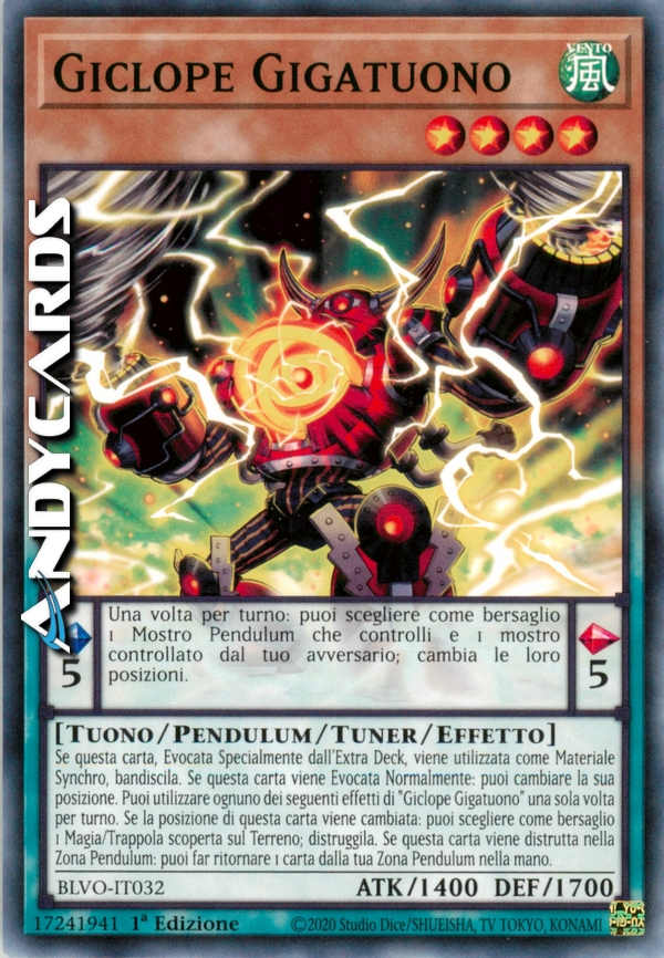 If this card, Special Summoned from the Extra Deck, is used as Synchro Material, banish it. If this card is Normal Summoned: You can change its battle position. You can only use each of the following effects of "Gigathunder Giclops" once per turn. If the battle position of this card is changed: You can target 1 face-up Spell/Trap on the field; destroy it. If this card is destroyed in the Pendulum Zone: You can return 1 card from your Pendulum Zone to the hand.