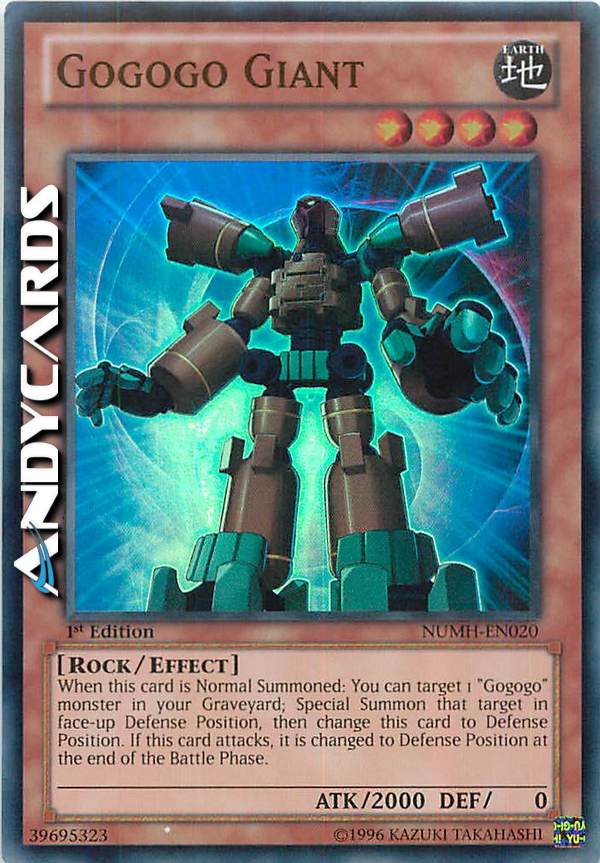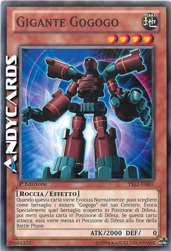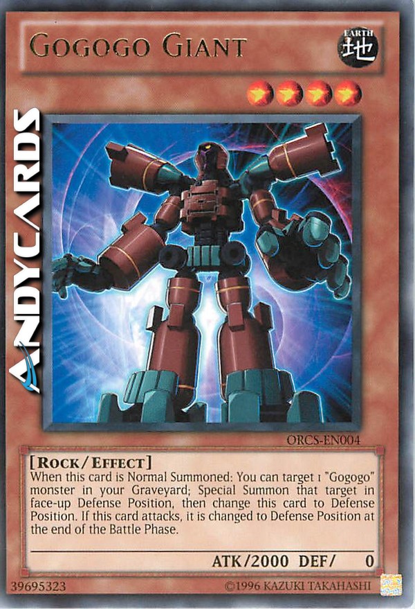 Quando questa carta viene Evocata Normalmente: puoi scegliere come bersaglio 1 mostro "Gogogo" nel tuo Cimitero; Evoca Specialmente quel bersaglio scoperto in Posizione di Difesa, poi metti questa carta in Posizione di Difesa. Se questa carta attacca, essa viene messa in Posizione di Difesa alla fine della Battle Phase.