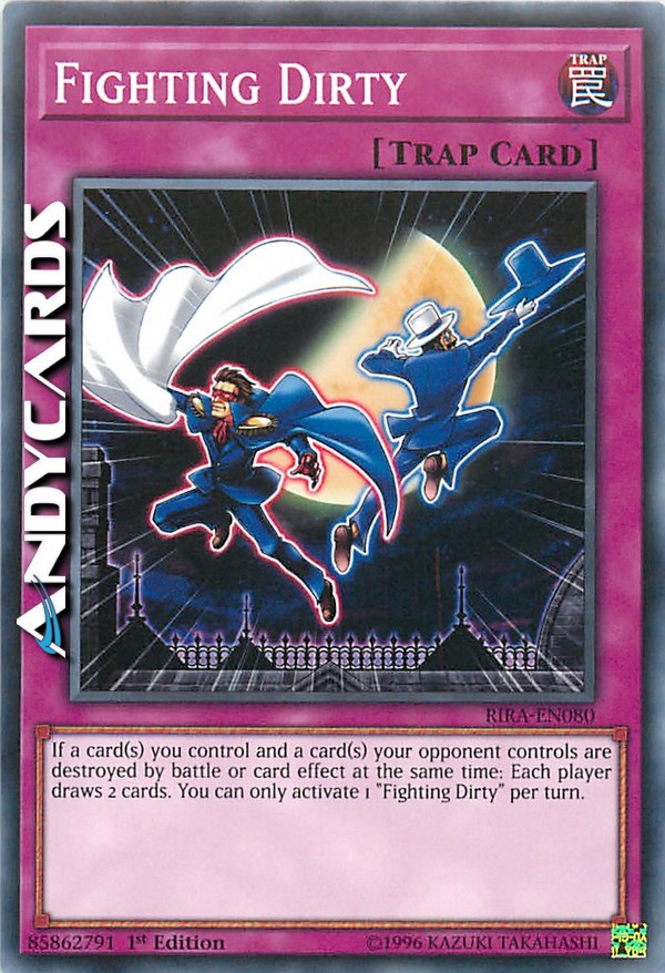 If a card(s) you control and a card(s) your opponent controls are destroyed by battle or card effect at the same time: Each player draws 2 cards. You can only activate 1 "Fighting Dirty" per turn.