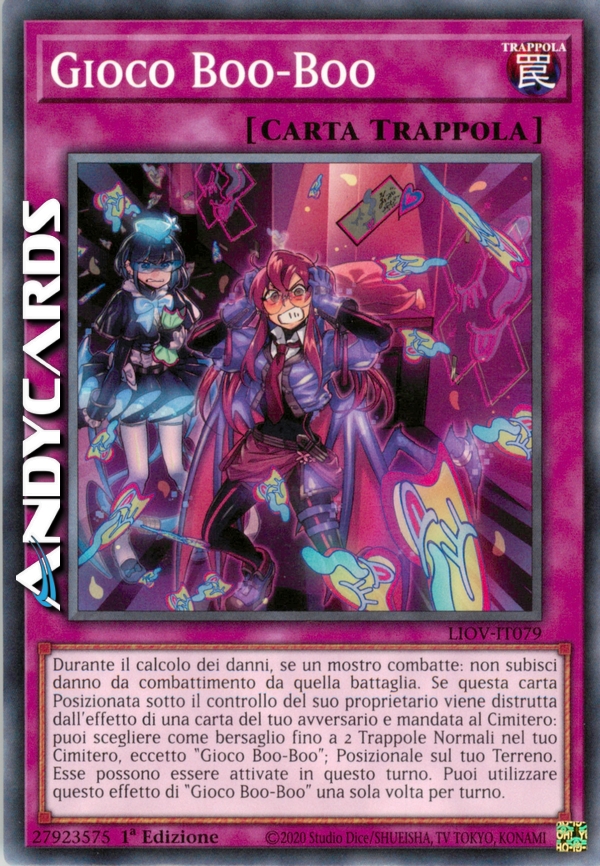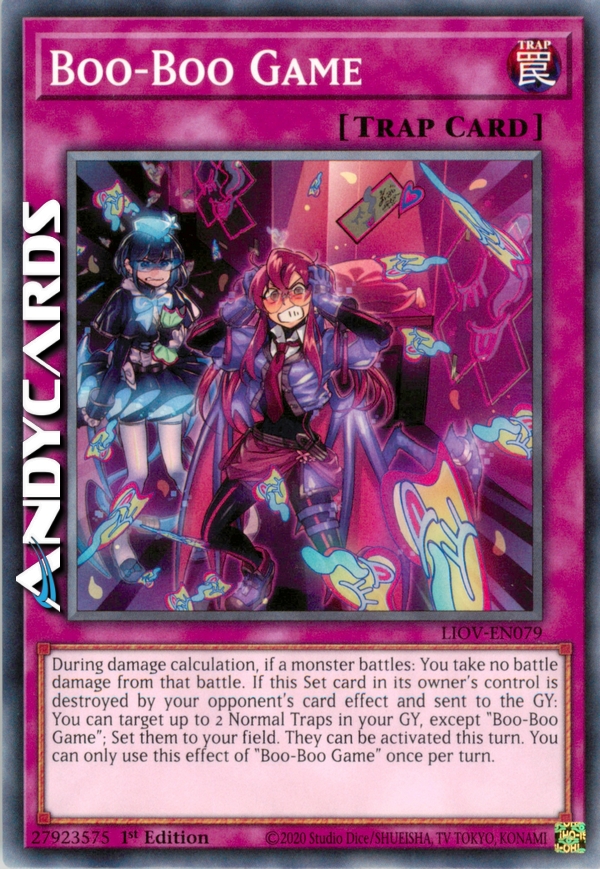 During damage calculation, if a monster battles: You take no battle damage from that battle. If this Set card in its owner's control is destroyed by your opponent's card effect and sent to the GY: You can target up to 2 Normal Traps in your GY, except "Boo-Boo Game"; Set them to your field. They can be activated this turn. You can only use this effect of "Boo-Boo Game" once per turn.