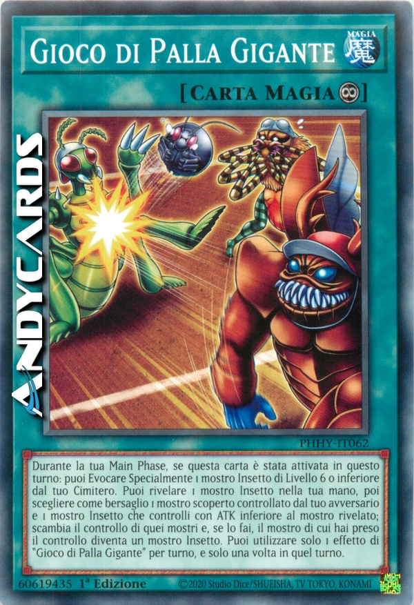 Durante la tua Main Phase, se questa carta è stata attivata in questo turno: puoi Evocare Specialmente 1 mostro Insetto di Livello 6 o inferiore dal tuo Cimitero. Puoi rivelare 1 mostro Insetto nella tua mano, poi scegliere come bersaglio 1 mostro scoperto controllato dal tuo avversario e 1 mostro Insetto che controlli con ATK inferiore al mostro rivelato; scambia il controllo di quei mostri e, se lo fai, il mostro di cui hai preso il controllo diventa un mostro Insetto. Puoi utilizzare solo 1 effetto di "Gioco di Palla Gigante" per turno, e solo una volta in quel turno.