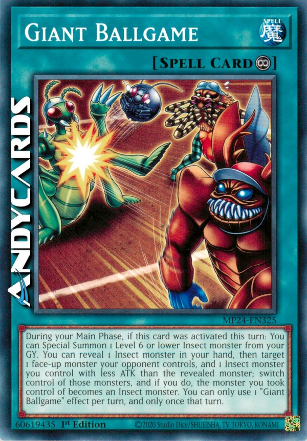 During your Main Phase, if this card was activated this turn: You can Special Summon 1 Level 6 or lower Insect monster from your GY. You can reveal 1 Insect monster in your hand, then target 1 face-up monster your opponent controls, and 1 Insect monster you control with less ATK than the revealed monster; switch control of those monsters, and if you do, the monster you took control of becomes an Insect monster. You can only use 1 "Giant Ballgame" effect per turn, and only once that turn.