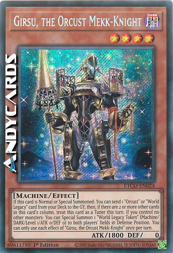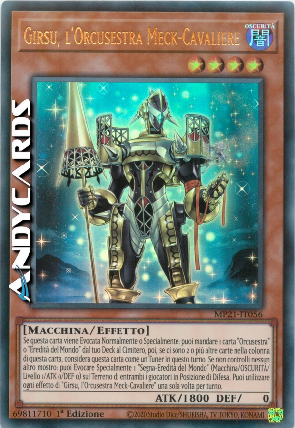 Se questa carta viene Evocata Normalmente o Specialmente: puoi mandare 1 carta "Orcusestra" o "Eredità del Mondo" dal tuo Deck al Cimitero, poi, se ci sono 2 o più altre carte nella colonna di questa carta, considera questa carta come un Tuner in questo turno. Se non controlli nessun altro mostro: puoi Evocare Specialmente 1 "Segna-Eredità del Mondo" (Macchina/OSCURITÀ/Livello 1/ATK 0/DEF 0) sul Terreno di entrambi i giocatori in Posizione di Difesa. Puoi utilizzare ogni effetto di "Girsu, l'Orcusestra Meck-Cavaliere" una sola volta per turno.