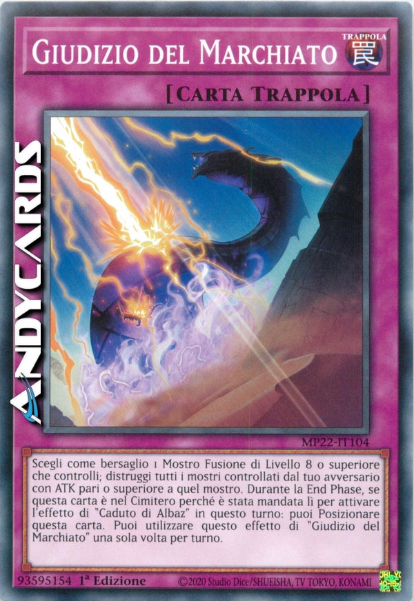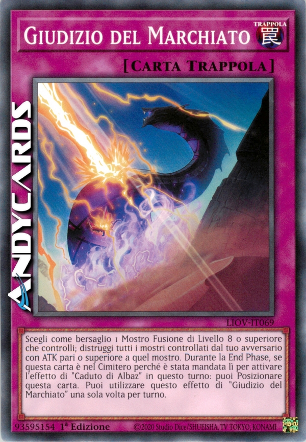 Scegli come bersaglio 1 Mostro Fusione di Livello 8 o superiore che controlli; distruggi tutti i mostri controllati dal tuo avversario con ATK pari o superiore a quel mostro. Durante la End Phase, se questa carta è nel Cimitero perché è stata mandata lì per attivare l'effetto di "Caduto di Albaz" in questo turno: puoi Posizionare questa carta. Puoi utilizzare questo effetto di "Giudizio del Marchiato" una sola volta per turno.