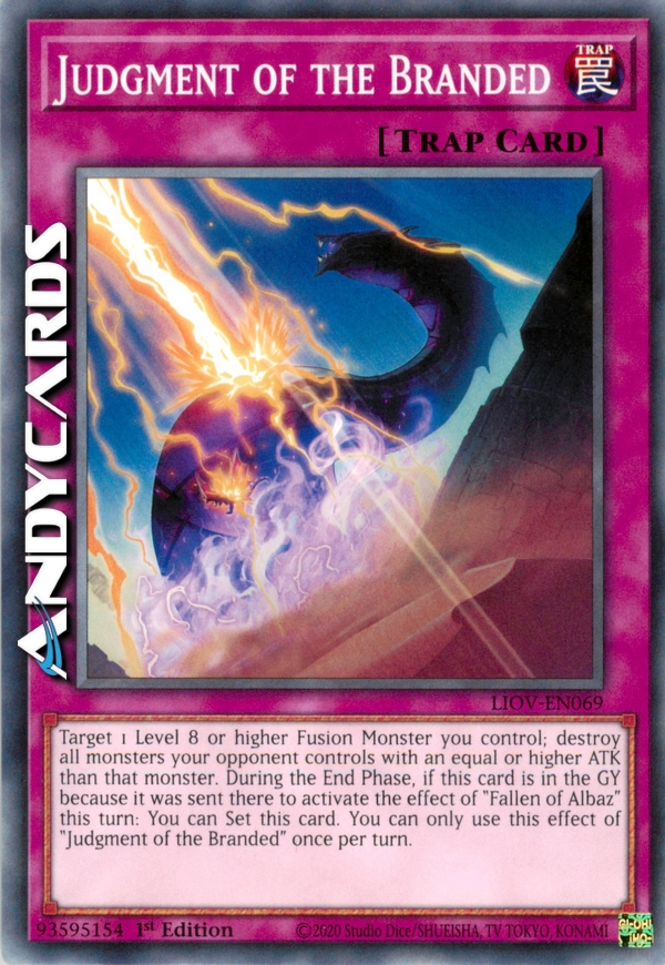 Target 1 Level 8 or higher Fusion Monster you control; destroy all monsters your opponent controls with an equal or higher ATK than that monster. During the End Phase, if this card is in the GY because it was sent there to activate the effect of "Fallen of Albaz" this turn: You can Set this card. You can only use this effect of "Judgment of the Branded" once per turn.