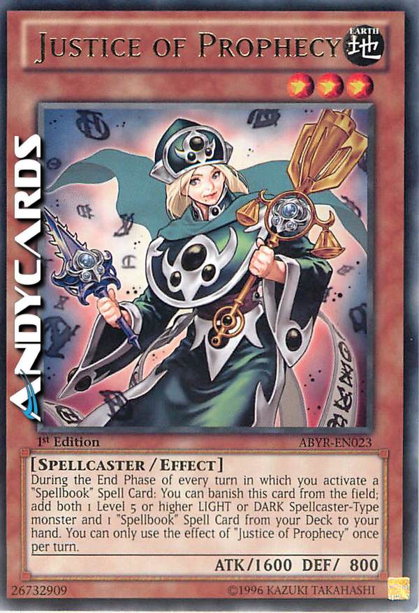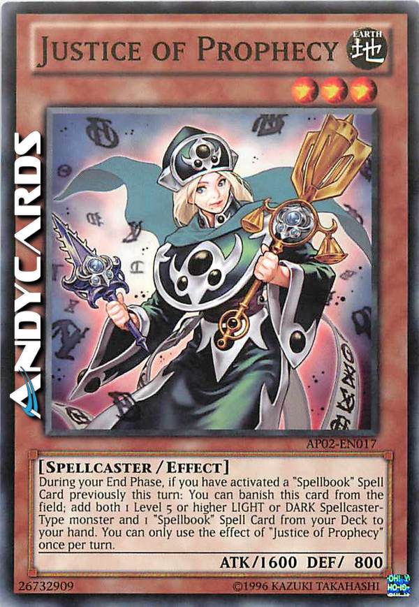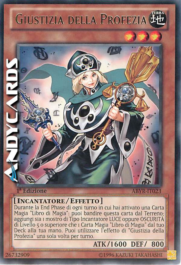 Durante la tua End Phase, se hai attivato una Carta Magia "Libro di Magia" in precedenza in questo turno: puoi bandire questa carta dal Terreno; aggiungi sia 1 mostro di Tipo Incantatore LUCE oppure OSCURITÀ di Livello 5 o superiore che 1 Carta Magia "Libro di Magia" dal tuo Deck alla tua mano. Puoi utilizzare l'effetto di "Giustizia della Profezia" una sola volta per turno.