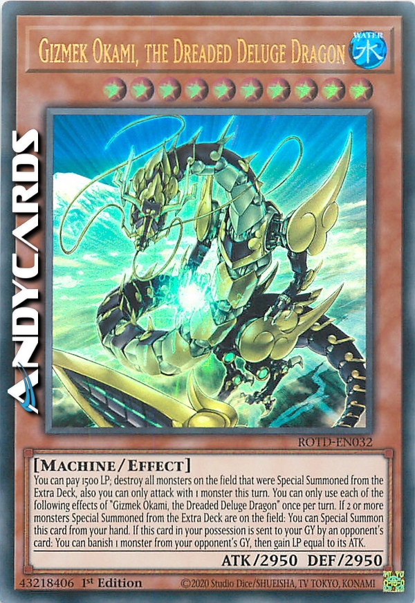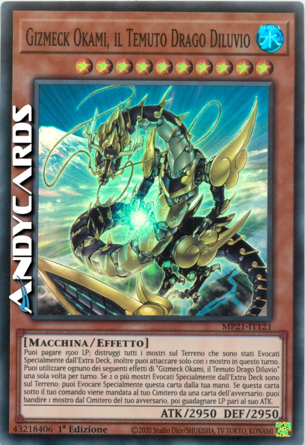 Puoi pagare 1500 LP; distruggi tutti i mostri sul Terreno che sono stati Evocati Specialmente dall'Extra Deck, inoltre puoi attaccare solo con 1 mostro in questo turno. Puoi utilizzare ognuno dei seguenti effetti di "Gizmeck Okami, il Temuto Drago Diluvio" una sola volta per turno. Se 2 o più mostri Evocati Specialmente dall'Extra Deck sono sul Terreno: puoi Evocare Specialmente questa carta dalla tua mano. Se questa carta sotto il tuo comando viene mandata al tuo Cimitero da una carta dell'avversario: puoi bandire 1 mostro dal Cimitero del tuo avversario, poi guadagnare LP pari al suo ATK.