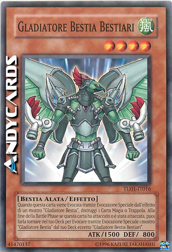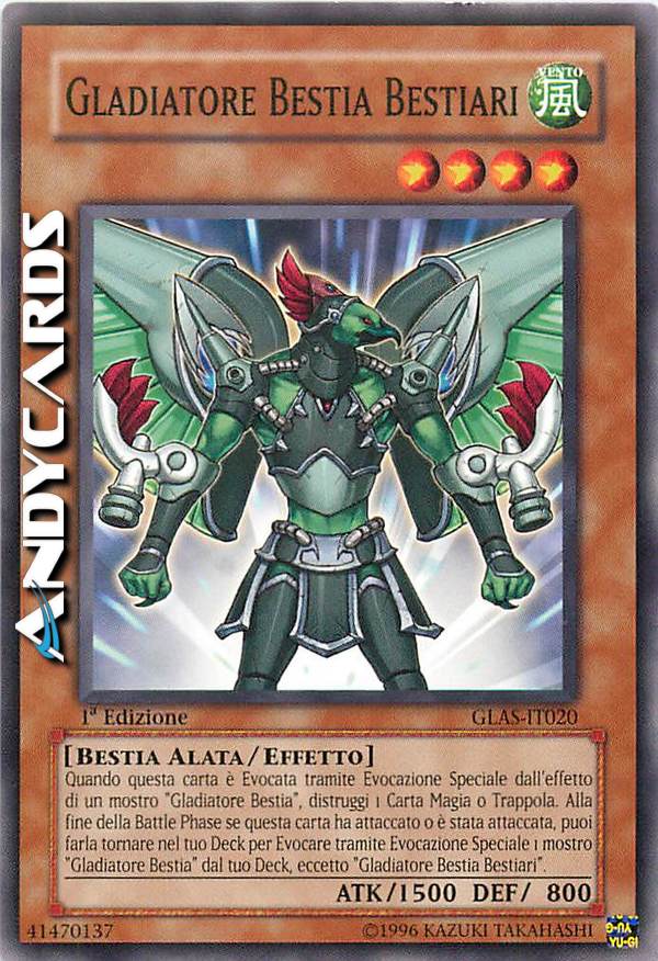 Quando questa carta è Evocata tramite Evocazione Speciale dall'effetto di un mostro “Gladiatore Bestia”, distruggi 1 Carta Magia o Trappola. Alla fine della Battle Phase se questa carta ha attaccato o è stata attaccata, puoi farla tornare nel tuo Deck per Evocare tramite Evocazione Speciale 1 mostro “Gladiatore Bestia” dal tuo Deck eccetto “Gladiatore Bestia Bestiari”.