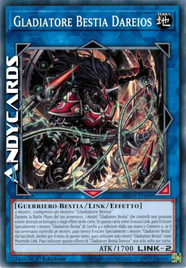 Durante la Battle Phase del tuo avversario, i mostri "Gladiatore Bestia" che controlli non possono essere distrutti in battaglia o dagli effetti delle carte. Se questa carta viene Evocata Link: puoi Evocare Specialmente 1 mostro "Gladiatore Bestia" di Livello 4 o inferiore dalla tua mano o Cimitero o, se il tuo avversario controlla un mostro, puoi invece Evocare Specialmente 1 mostro "Gladiatore Bestia" dal tuo Deck, inoltre per il resto di questo turno, puoi utilizzare solo mostri "Gladiatore Bestia" come Materiale Link. Puoi utilizzare questo effetto di "Gladiatore Bestia Dareios" una sola volta per turno.