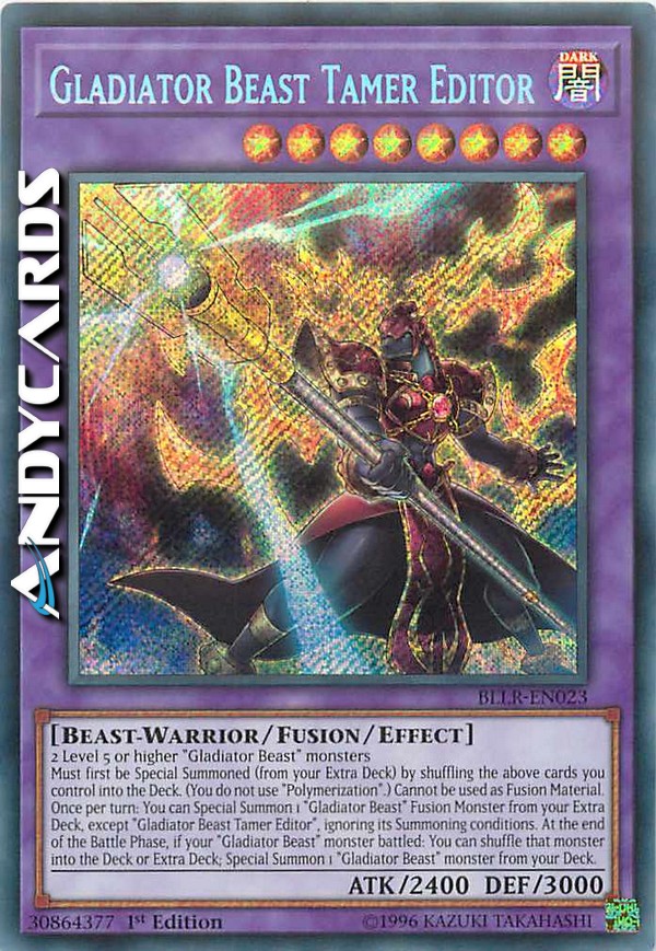 Must first be Special Summoned (from your Extra Deck) by shuffling the above cards you control into the Deck. (You do not use "Polymerization".) Cannot be used as Fusion Material. Once per turn: You can Special Summon 1 "Gladiator Beast" Fusion Monster from your Extra Deck, except "Gladiator Beast Tamer Editor", ignoring its Summoning conditions. At the end of the Battle Phase, if your "Gladiator Beast" monster battled: You can shuffle that monster into the Deck or Extra Deck; Special Summon 1 "Gladiator Beast" monster from your Deck.