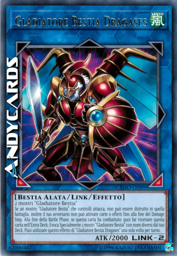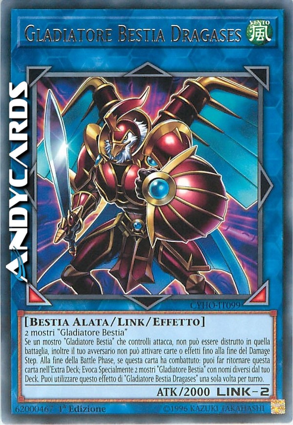 Se un mostro "Gladiatore Bestia" che controlli attacca, non può essere distrutto in quella battaglia, inoltre il tuo avversario non può attivare carte o effetti fino alla fine del Damage Step. Alla fine della Battle Phase, se questa carta ha combattuto: puoi far ritornare questa carta nell'Extra Deck; Evoca Specialmente 2 mostri "Gladiatore Bestia" con nomi diversi dal tuo Deck. Puoi utilizzare questo effetto di "Gladiatore Bestia Dragases" una sola volta per turno.