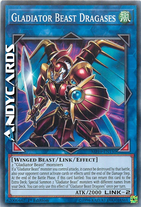 If a "Gladiator Beast" monster you control attacks, it cannot be destroyed by that battle, also your opponent cannot activate cards or effects until the end of the Damage Step. At the end of the Battle Phase, if this card battled: You can return this card to the Extra Deck; Special Summon 2 "Gladiator Beast" monsters with different names from your Deck. You can only use this effect of "Gladiator Beast Dragases" once per turn.