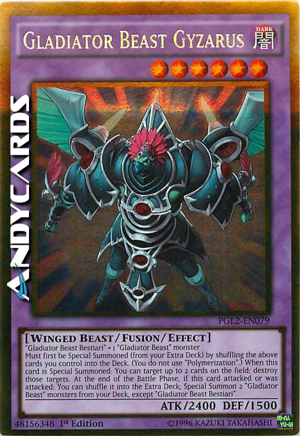 Must first be Special Summoned (from your Extra Deck) by shuffling the above cards you control into the Deck. (You do not use "Polymerization".) When this card is Special Summoned: You can target up to 2 cards on the field; destroy those targets. At the end of the Battle Phase, if this card battled: You can return it to the Extra Deck; Special Summon 2 "Gladiator Beast" monsters from your Deck, except "Gladiator Beast Bestiari".