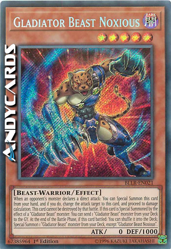 When an opponent's monster declares a direct attack: You can Special Summon this card from your hand, and if you do, change the attack target to this card, and proceed to damage calculation. This card cannot be destroyed by that battle. If this card is Special Summoned by the effect of a "Gladiator Beast" monster: You can send 1 "Gladiator Beast" monster from your Deck to the GY. At the end of the Battle Phase, if this card battled: You can shuffle it into the Deck; Special Summon 1 "Gladiator Beast" monster from your Deck, except "Gladiator Beast Noxious".