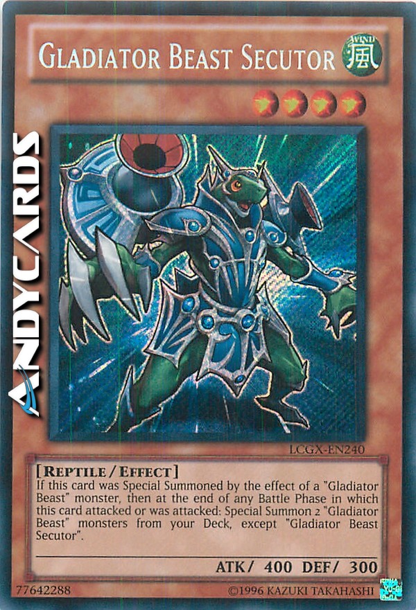 If this card was Special Summoned by the effect of a "Gladiator Beast" monster, at the end of any Battle Phase, if this card attacked or was attacked, Special Summon 2 "Gladiator Beast" monsters from your Deck, except "Gladiator Beast Secutor".