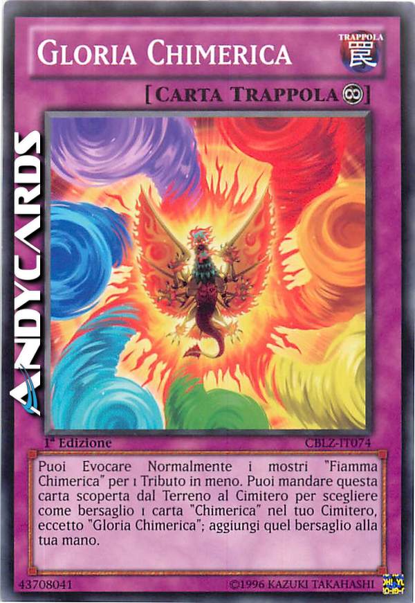 Puoi Evocare Normalmente i mostri "Fiamma Chimerica" per 1 Tributo in meno. Puoi mandare questa carta scoperta dal Terreno al Cimitero per scegliere come bersaglio 1 carta "Chimerica" nel tuo Cimitero, eccetto "Gloria Chimerica"; aggiungi quel bersaglio alla tua mano.
