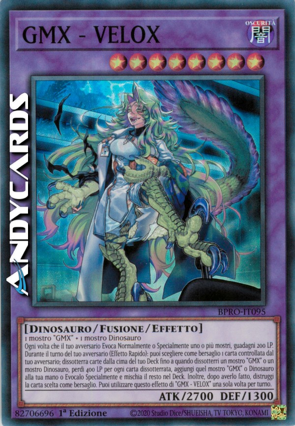 Ogni volta che il tuo avversario Evoca Normalmente o Specialmente uno o più mostri, guadagni 200 LP. Durante il turno del tuo avversario (Effetto Rapido): puoi scegliere come bersaglio 1 carta controllata dal tuo avversario; dissotterra carte dalla cima del tuo Deck fino a quando dissotterri un mostro "GMX" o un mostro Dinosauro, perdi 400 LP per ogni carta dissotterrata, aggiungi quel mostro "GMX" o Dinosauro alla tua mano o Evocalo Specialmente e mischia il resto nel Deck. Inoltre, dopo averlo fatto, distruggi la carta scelta come bersaglio. Puoi utilizzare questo effetto di "GMX - VELOX" una sola volta per turno.