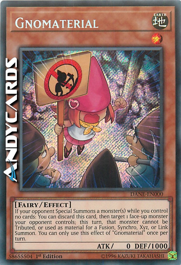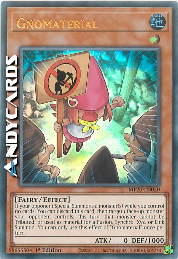 If your opponent Special Summons a monster(s) while you control no cards: You can discard this card, then target 1 face-up monster your opponent controls; this turn, that monster cannot be Tributed, or used as material for a Fusion, Synchro, Xyz, or Link Summon. You can only use this effect of "Gnomaterial" once per turn.