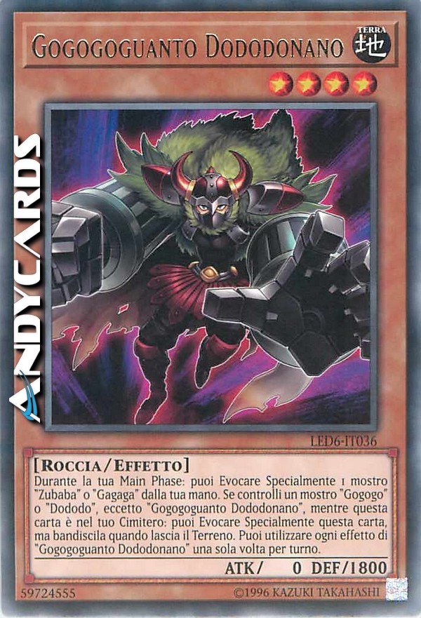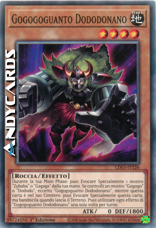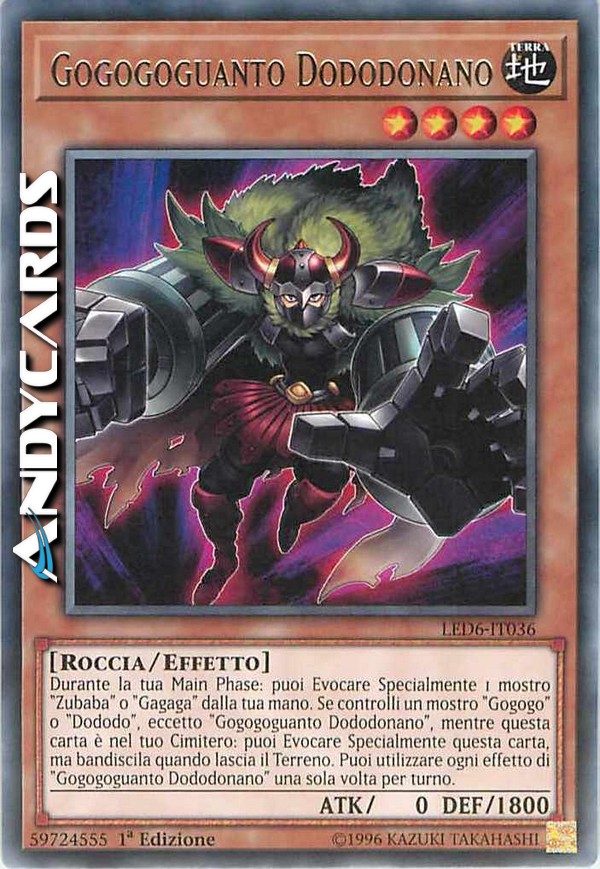 Durante la tua Main Phase: puoi Evocare Specialmente 1 mostro "Zubaba" o "Gagaga" dalla tua mano. Se controlli un mostro "Gogogo" o "Dododo", eccetto "Gogogoguanto Dododonano", mentre questa carta è nel tuo Cimitero: puoi Evocare Specialmente questa carta, ma bandiscila quando lascia il Terreno. Puoi utilizzare ogni effetto di "Gogogoguanto Dododonano" una sola volta per turno.