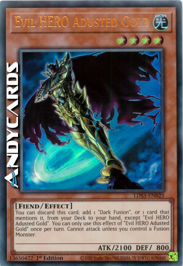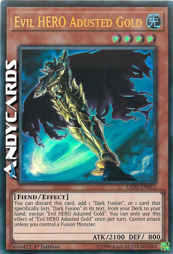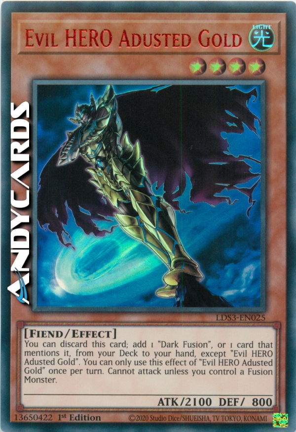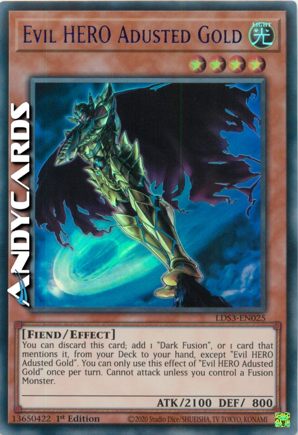 You can discard this card; add 1 "Dark Fusion", or 1 card that specifically lists "Dark Fusion" in its text, from your Deck to your hand, except "Evil HERO Adusted Gold". You can only use this effect of "Evil HERO Adusted Gold" once per turn. Cannot attack unless you control a Fusion Monster.