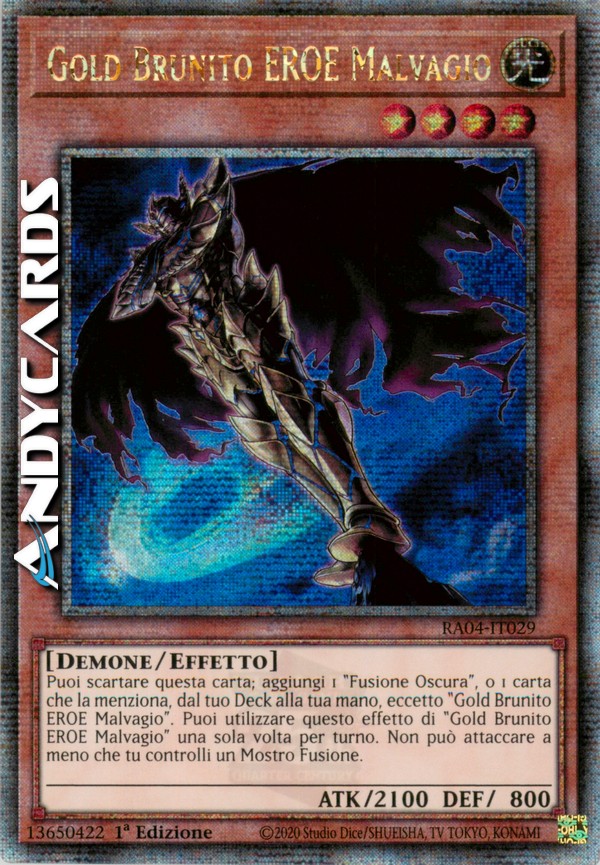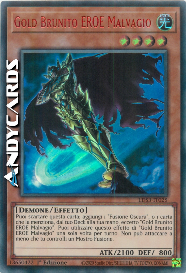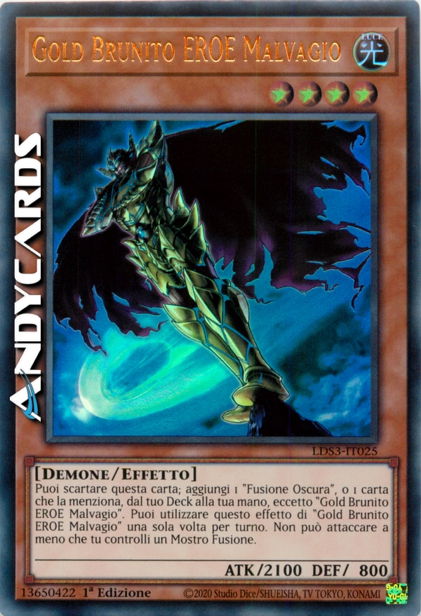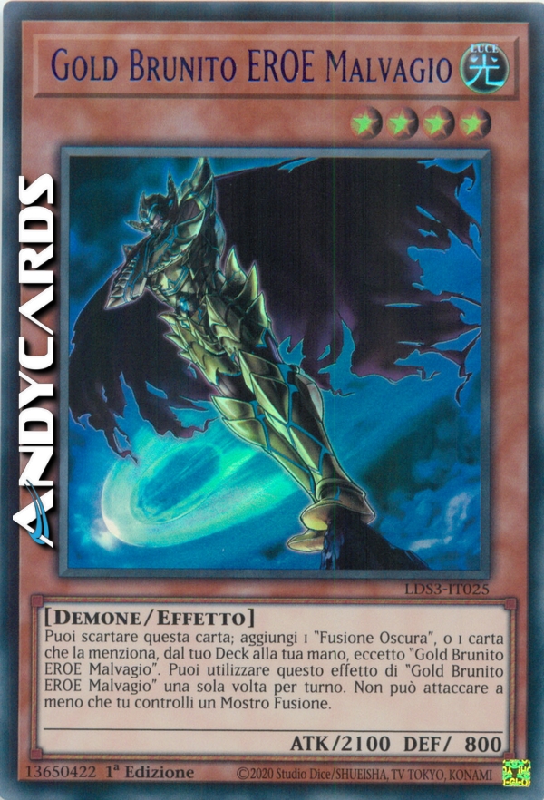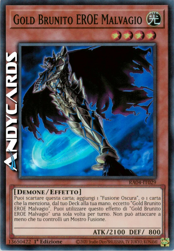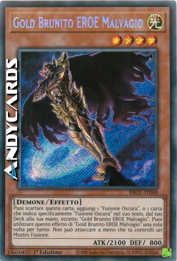 Puoi scartare questa carta; aggiungi 1 "Fusione Oscura", o 1 carta che indica specificamente "Fusione Oscura" nel suo testo, dal tuo Deck alla tua mano, eccetto "Gold Brunito EROE Malvagio". Puoi utilizzare questo effetto di "Gold Brunito EROE Malvagio" una sola volta per turno. Non può attaccare a meno che tu controlli un Mostro Fusione.