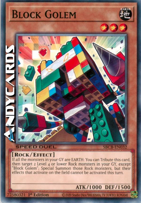 Se tutti i mostri nel tuo Cimitero sono TERRA: puoi offrire come Tributo questa carta per scegliere come bersaglio 2 mostri di Tipo Roccia di Livello 4 o inferiore nel tuo Cimitero, eccetto "Golem Blocco"; Evoca Specialmente quei bersagli, ma i loro effetti che si attivano sul Terreno non possono essere attivati in questo turno.