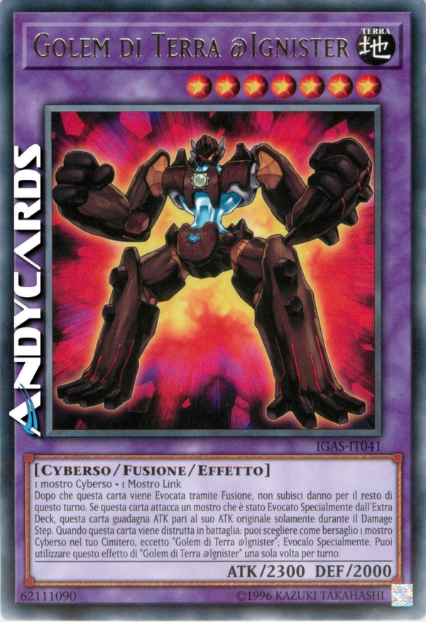 Dopo che questa carta viene Evocata tramite Fusione, non subisci danno per il resto di questo turno. Se questa carta attacca un mostro che è stato Evocato Specialmente dall'Extra Deck, questa carta guadagna ATK pari al suo ATK originale solamente durante il Damage Step. Quando questa carta viene distrutta in battaglia: puoi scegliere come bersaglio 1 mostro Cyberso nel tuo Cimitero, eccetto "Golem di Terra @Ignister"; Evocalo Specialmente. Puoi utilizzare questo effetto di "Golem di Terra @Ignister" una sola volta per turno.