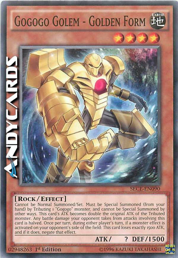 Non può essere Evocato Normalmente/Posizionato. Deve essere Evocato Specialmente (dalla tua mano) offrendo come Tributo 1 mostro "Gogogo", e non può essere Evocato Specialmente in altri modi. L'ATK di questa cata diventa il doppio dell'ATK originale del mostro offerto come Tributo. Qualsiasi danno da combattimento che il tuo avversario subisce da attacchi che coinvolgono questa carta viene dimezzato. Una volta per turno, durante il turno di qualsiasi giocatore, se viene attivato l'effetto di un mostro sul Terreno del tuo avversario: Questa carta perde esattamente 1500 ATK e, se lo fa, annulla quell'effetto.