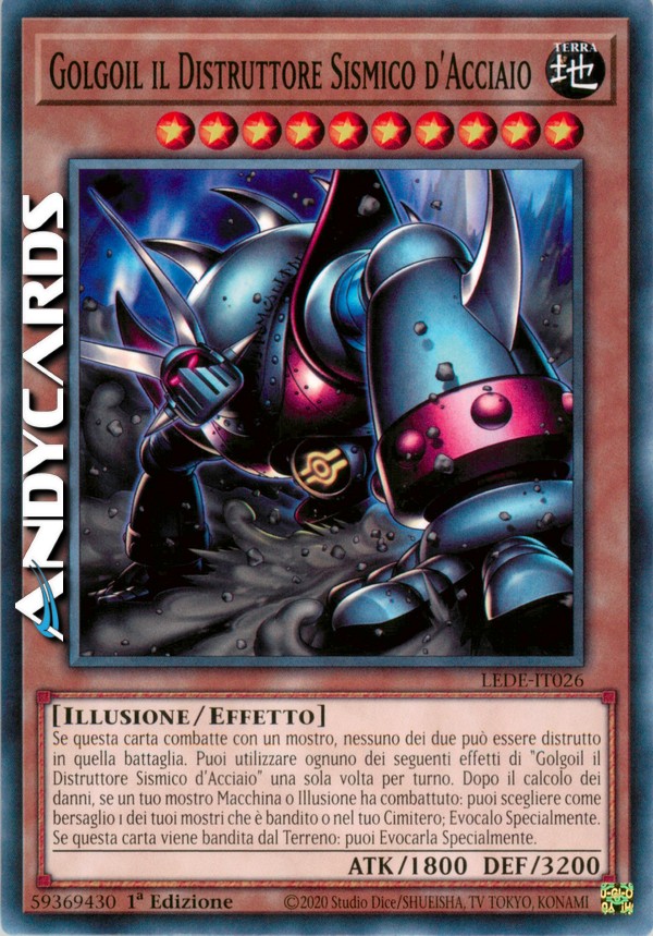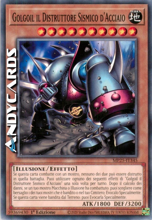 Se questa carta combatte con un mostro, nessuno dei due può essere distrutto in quella battaglia. Puoi utilizzare ognuno dei seguenti effetti di "Golgoil il Distruttore Sismico d'Acciaio" una sola volta per turno. Dopo il calcolo dei danni, se un tuo mostro Macchina o Illusione ha combattuto: puoi scegliere come bersaglio 1 dei tuoi mostri che è bandito o nel tuo Cimitero; Evocalo Specialmente. Se questa carta viene bandita dal Terreno: puoi Evocarla Specialmente.