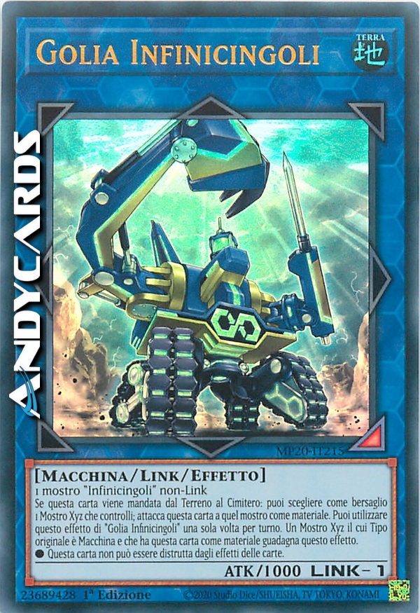 Se questa carta viene mandata dal Terreno al Cimitero: puoi scegliere come bersaglio 1 Mostro Xyz che controlli; attacca questa carta a quel mostro come materiale. Puoi utilizzare questo effetto di "Golia Infinicingoli" una sola volta per turno. Un Mostro Xyz il cui Tipo originale è Macchina e che ha questa carta come materiale guadagna questo effetto.