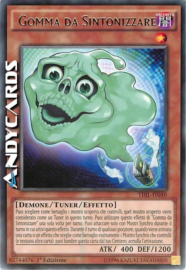Puoi scegliere come bersaglio 1 mostro scoperto che controlli; quel mostro scoperto viene considerato come un Tuner in questo turno. Puoi utilizzare questo effetto di "Gomma da Sintonizzare" una sola volta per turno. Puoi attaccare solo con Mostri Synchro durante il turno in cui attivi questo effetto. Durante il turno di qualsiasi giocatore, quando viene attivata una carta o un effetto che sceglie come bersaglio esattamente 1 Mostro Synchro che controlli (e nessuna altra carta): puoi bandire questa carta dal tuo Cimitero; annulla l'attivazione.