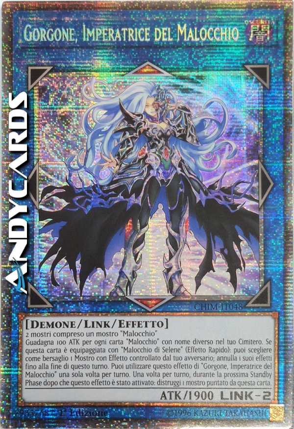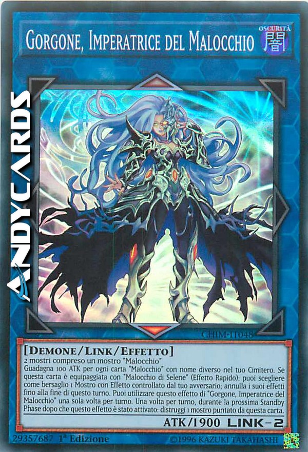 Guadagna 100 ATK per ogni carta "Malocchio" con nome diverso nel tuo Cimitero. Se questa carta è equipaggiata con "Malocchio di Selene" (Effetto Rapido): puoi scegliere come bersaglio 1 Mostro con Effetto controllato dal tuo avversario; annulla i suoi effetti fino alla fine di questo turno. Puoi utilizzare questo effetto di "Gorgone, Imperatrice del Malocchio" una sola volta per turno. Una volta per turno, durante la prossima Standby Phase dopo che questo effetto è stato attivato: distruggi 1 mostro puntato da questa carta.